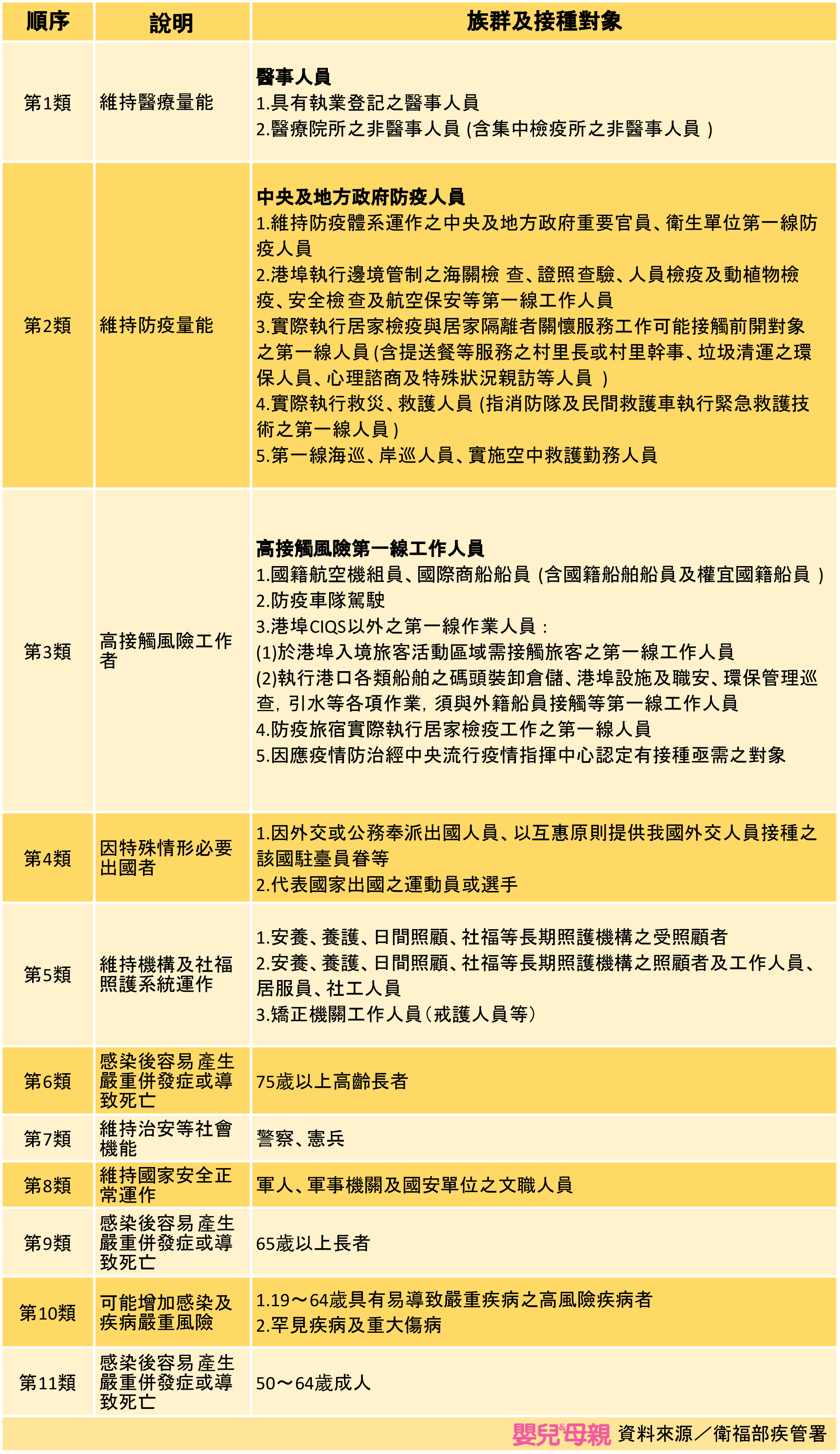 疫苗接種順序 - å³ææ¶æ¯ èºå榮æ°'總é«é¢é³³æåé¢ - 維持防疫體系運作之中央及地方政府重要官員 · 衛生單位第一線防疫人員(註1) · 港埠執行邊境管制之海關檢查(customs)、證照查驗(immigration)、人員檢疫及 .. 維持防疫體系運作之中央及地方政府重要官員 · 衛生單位第一線防疫人員(註1) · 港埠執行邊境管制之海關檢查(customs)、證照查驗(immigration)、人員檢疫及 .